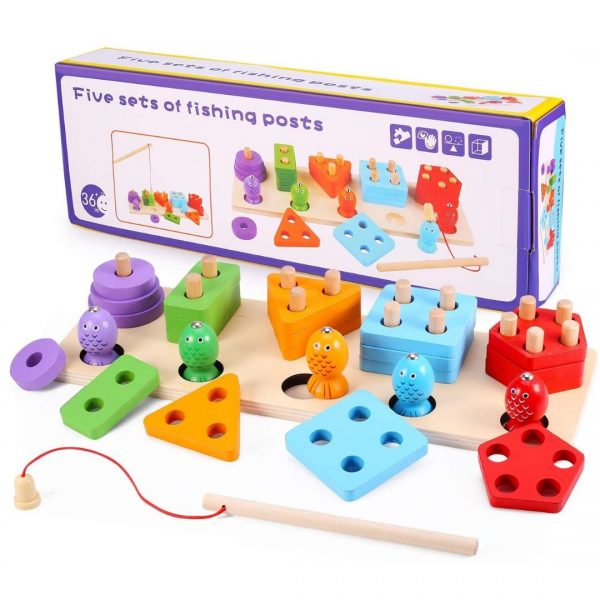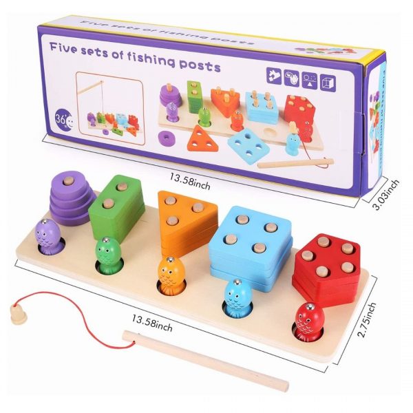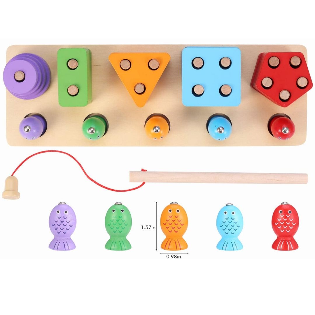 A game made of wood. Allows children to recognize geometric figures and colors. By remembering the color and shape, children play to catch the fish, developing motor skills and visual coordination, their logical and cognitive thinking.